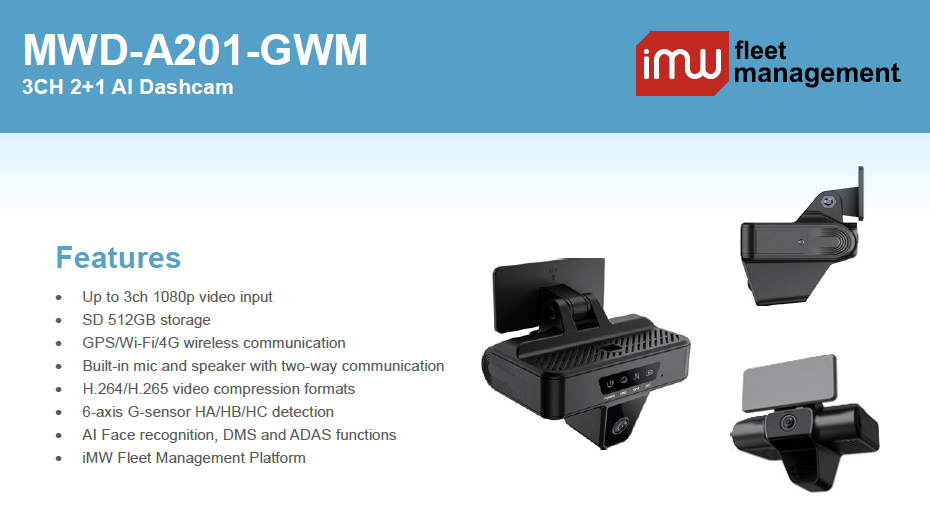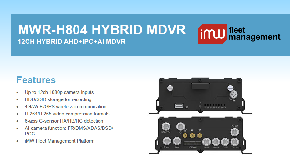 Description Our extensive range of products and systems includes iMW Fleet Mangement Software, Dashcamd, Mobile DVR (MDVR), Mobile NVR (MNVR), Mobile Data Terminal (MDT), and Artificial Intelligence products such as Face Recognition, Driver Monitoring System (DMS), Advanced Driver Assistance System (ADAS), Blind Spot Detection (BSD), 360-degree Around View Monitoring (360AVM), and Automatic Number Plate Recognition (ANPR). We cater to various vehicle industries such as logistics, taxi services, oil and gas, school bus transportation, public buses, police vehicles, and more.